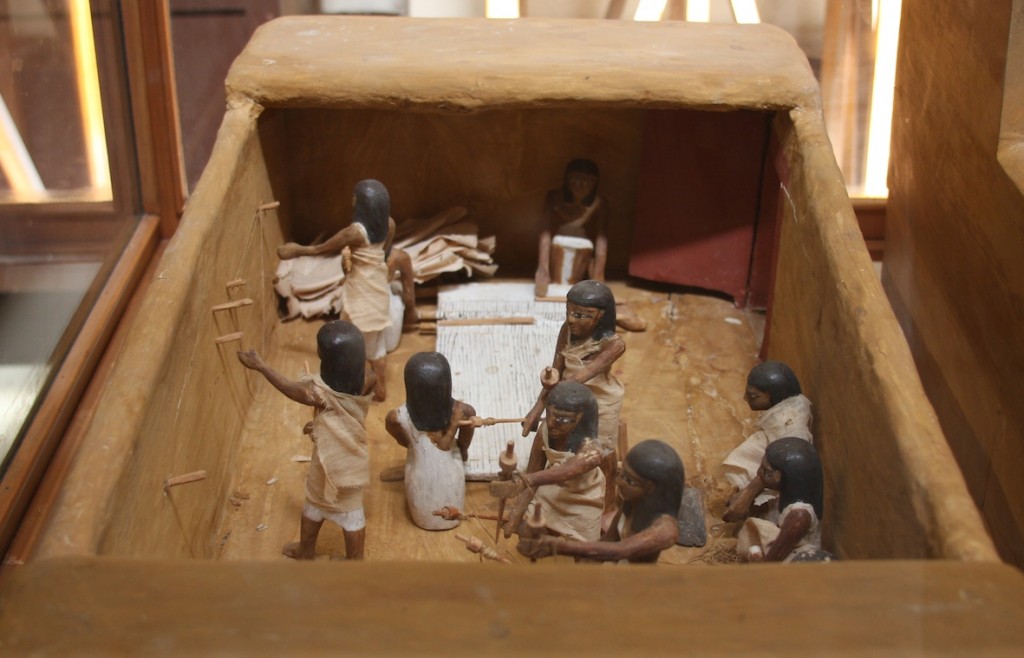 The weavers in Meketre’s tomb are using a ground loom for their thread, which means the threads are tied to sticks on both ends, parallel to the ground. Those threads are called the warp and are held stationary. The women are seated or kneeling nearby. They feed the weft thread through from the side, over and below the warp threads. Once a row is complete, the weft threads are jammed tight with a stick and the next row begins.