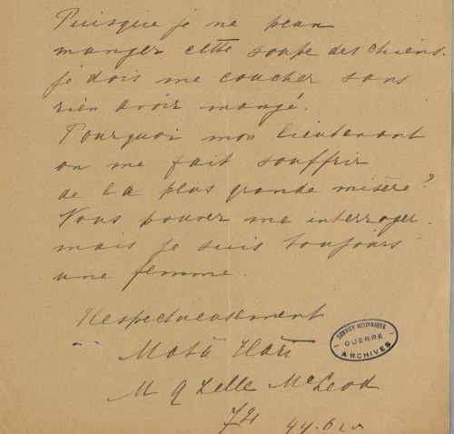 Because I cannot eat this soup of dogs, I must go to bed without having eaten anything. Why, my liutenant, do they make me suffer the greatest misery? You can interrogate me, but I am still a woman. Respectifully, Mata Hari, Madame Zelle McLeod.
