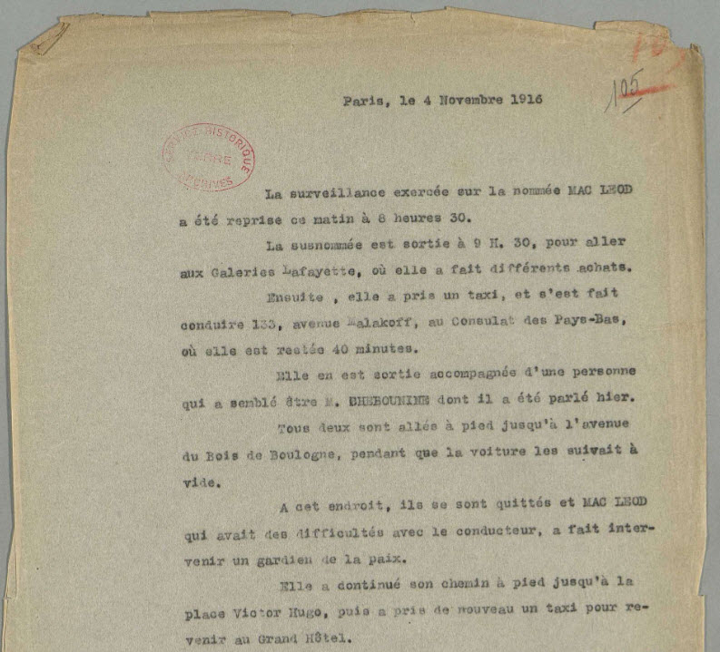One of the surveillance reports on Mata Hari. On November 4, 1916, she went shopping at 9:30 at the Galeries Lafayette. Then she took a taxi to the Dutch Consulat. She came out with a man, and the two walked to the Bois de Boulogne, while a taxi followed them. The two parted, the taxi driver caused some difficulty, and she called a security guard. She then continued on foot for a while, and then took a new taxi back to her hotel.