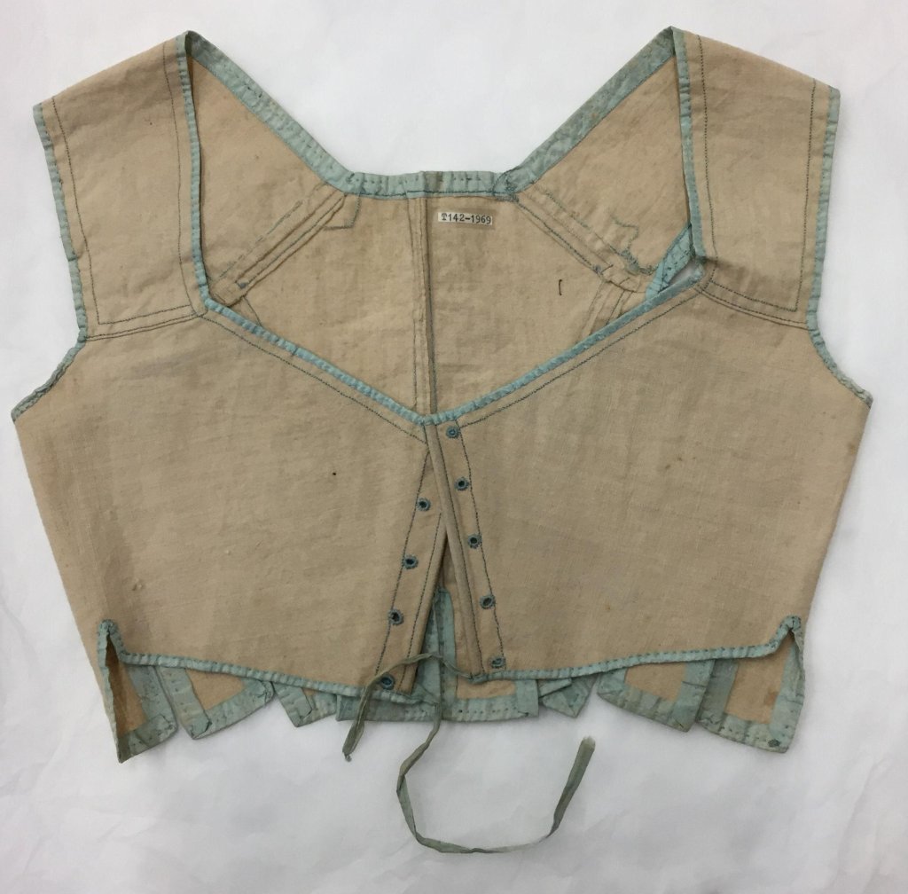 The corsets that we now love to hate had their origin much later (Steele, 4,7). The word first appears in the 14ᵗʰ century, but it meant a dress (the whole dress) that included a fitted bodice (Bruno, 32). Even later on, there’s a lot of vocabulary confusion between the word “corset” and “corselette” and “stays” and “body” and “busk” and half a dozen other things. Not only are the words inconsistent, but so are the desired functions of the thing, whatever we’re calling it. If I use any vocabulary that doesn’t match your own knowledge, the chances are good that we’re both right, just for different time periods and different locations.