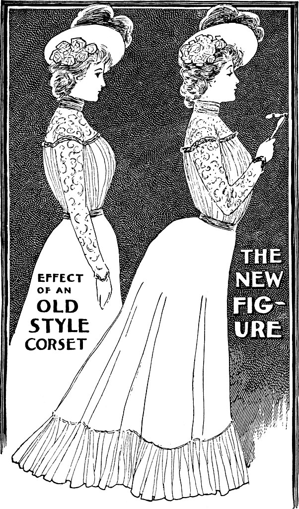 Dress reformers complained enough to make some headway. Women’s rights activists declared that women were free, their waists included. The fashions changed. The S-shaped figure was seen for the ridiculous goose-like posture that it is.