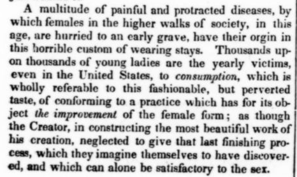 For another thing, it assumes that no woman ever put one of these things on of her own free will. But the first-hand accounts suggest that the people demanding that girls don the dreaded device were not men, rich or otherwise. It was usually an older female: your mother, your governess, or your boarding school mistress (Steele, 51). These are the ones for which we have written accounts. The lower classes, of course, just left us fewer records.