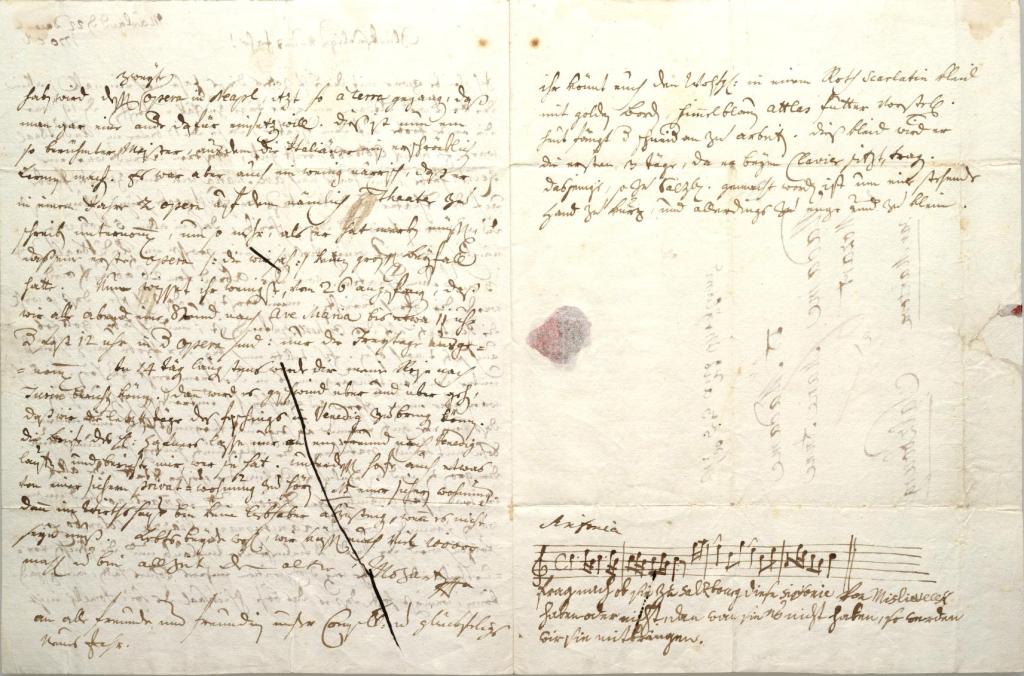 This is a letter that Leopold wrote to his wife from Italy. However, it has a postscript at the end in Wolfgang’s hand. He gives the opening measures of an overture by Josef Mysliveček. Wolfgang is asking Nannerl if she has the score of the overture at home in Salzburg, and if she doesn’t, he will bring it home for her. (Library of Congress)