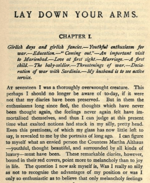 The first page of the English translation of Lay Down Your Arms (Internet Archive)