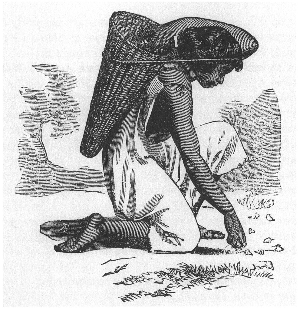 An 1886 depiction of a Native American woman gathering acorns in Yosemite Valley (Wikimedia Commons)