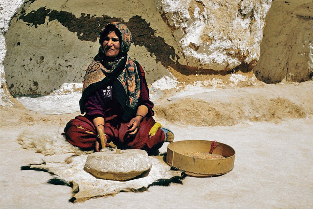 Woman in Tunisia with a rotary quern. This woman is posing for tourists, but for many historical women this was a pose that was all too real for hours of every day, grinding the grain to make it edible (Wikimedia Commons)