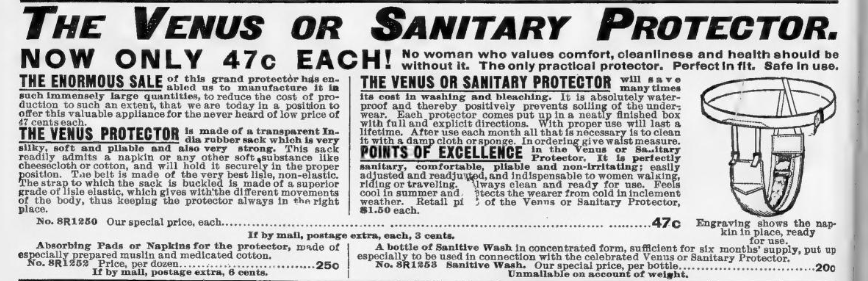 Anyway, back to the subject at hand, effective period management was about to see innovations. When Sears Roebuck began carrying pre-packaged pads in the 1890s, they were not very successful (Vostral, 5). But in general, they were on to something. The necessary product supply chain and sale networks now existed. There were public health initiatives about raising the standards of hygiene. There were girls and women entering the business world, whether it be in a factory or an office. Your boss (almost certainly a man) was probably not going to be sympathetic about monthly time off or a trail of blood. These women could no longer conceal it by staying in bed, or at least at home.