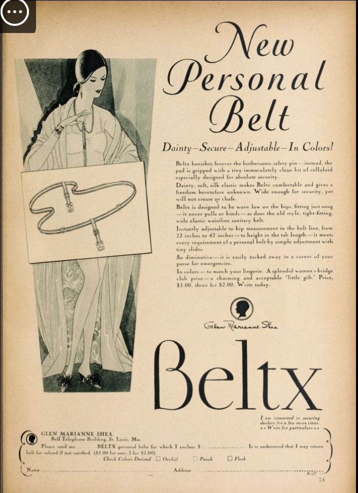 With no adhesive and no elastic (and in earlier eras, no underwear), women fixed that pad in place with a sanitary belt. You tied, clasped, or buckled that belt around your waist and your pad has tabs long enough to pin, clasp or tie onto the belt, front and back. That’s how it stays in place (Bullough, 625). The sticky adhesives that are used today were not introduced until 1970 (Renault).